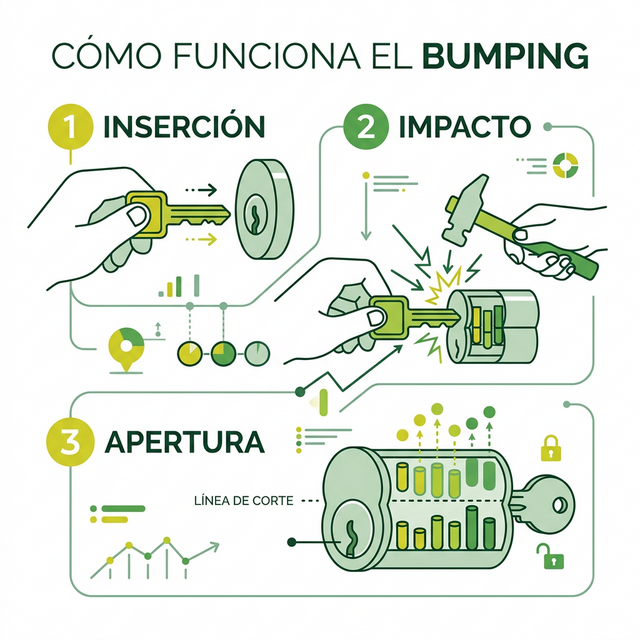 El bumping o técnica de percusión es un método de apertura limpia que permite abrir cilindros de puertas en menos de 30 segundos sin necesidad de forzarlos. El ladrón solo necesita una llave modificada (llamada "llave bump") y un pequeño objeto para golpearla (como un destornillador o martillo plástico).